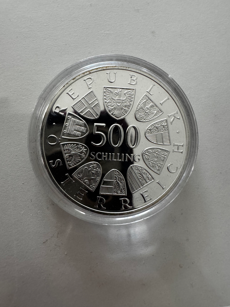 Die abgebildete Münze ist die österreichische 500-Schilling-Gedenkmünze in polierter Platte (PP) von 1983, die das Parlamentsgebäude in Wien darstellt.